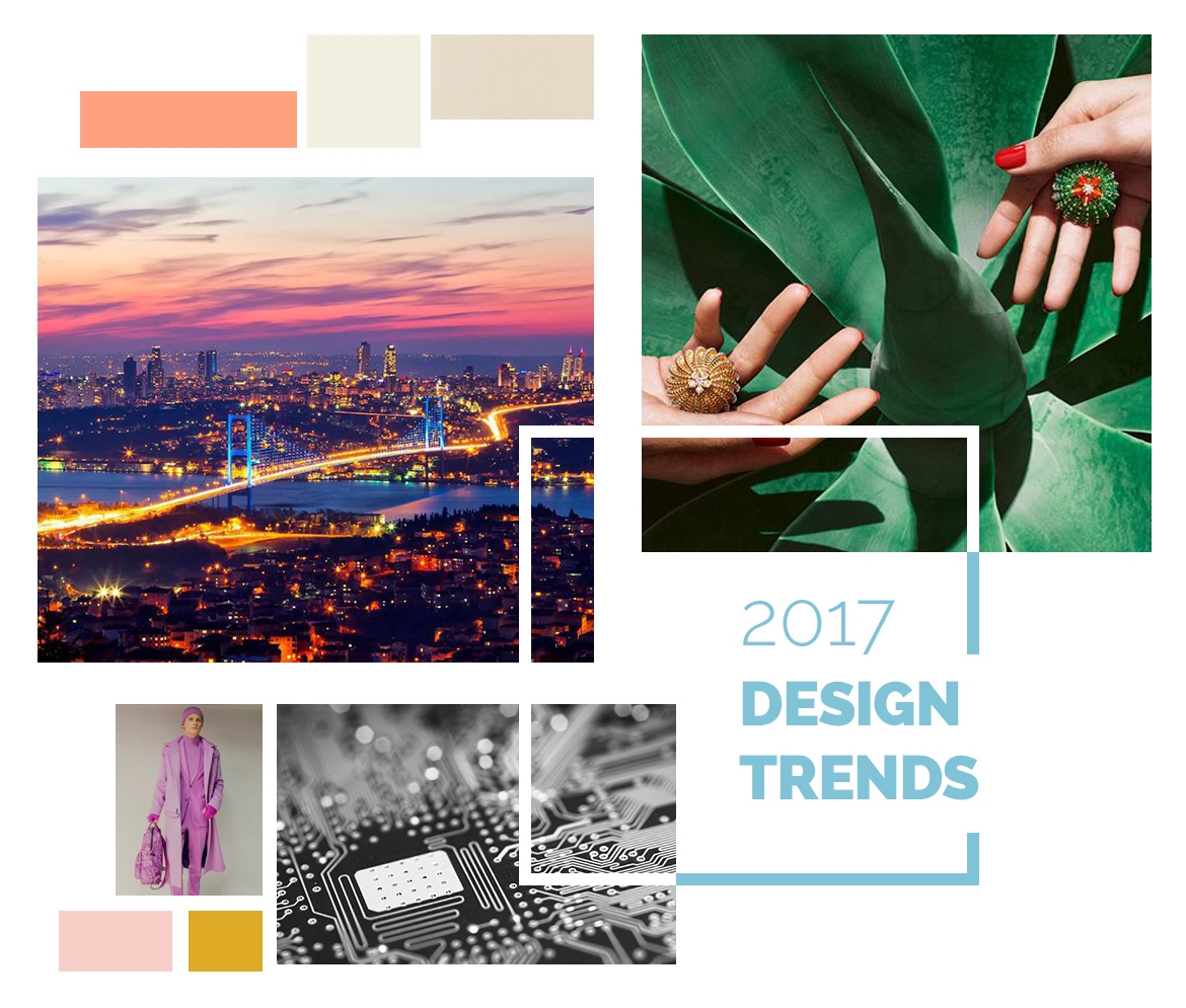 The design trends of 2017 show that, while colors such as sky blue, light pink, sand, ecru, earth tones, dark saffron, greyish blue, and powder represent introversion and neo-Romanticism, bright pinks, purple, green and epoxy blue tones, ocean blue, flamingo pink, mineral yellow, mint green and lilac tones represent city life and virtual lives.